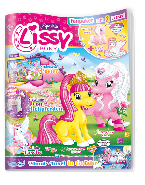 Alle 6 Wochen warten auf euch kunterbunte 36 Seiten, mit denen ihr noch weiter in die traumhafte Welt der Lissy PONYs eintauchen könnt. Mit spannenden Comics, kniffligen Rätseln, tollen Gewinnspielen, vielen Activity-Seiten mit Malvorlagen, Bastelideen und bunten Postern, lässt das Magazin das Herz eines jeden Mädchens höherschlagen. Unentbehrlich sind dabei auch die Steckbriefe mit allen Infos zu den verschiedenen Ponys.
